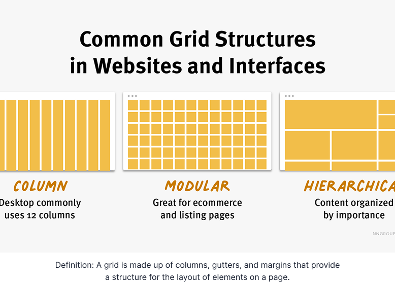 There are three common grid types used in websites and interfaces: column grid, modular grid, and hierarchical grid.