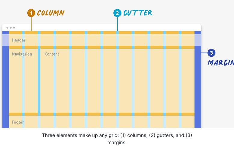 Regardless of the type of grid you are using, the grid is made up of three elements: columns, gutters, and margins.