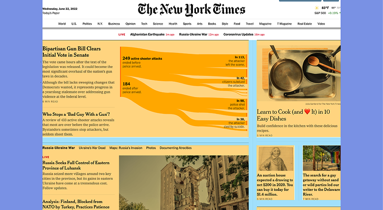 Our first example is from The New York Times. This screen utilizes a hierarchical grid to create a newspaper-like reading experience. At desktop screen size, two main columns make up the hierarchical grid. The most important news story takes up the most space in the grid, the left column, followed by secondary and tertiary stories, which take up the smaller column and modules on the right.