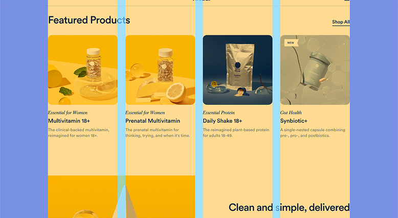 Our second example is from Ritual.com, a vitamin company. This design uses a column grid to create an attractive visual experience. At this screen size, four consistently sized columns make up the grid structure and elements are aligned to and within these columns. The gutters, the spaces in between the columns, are also consistently sized and help the user visually separate the different products. The margins are independently sized and are the same between the left and right sides.